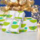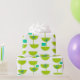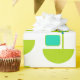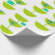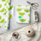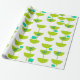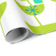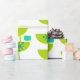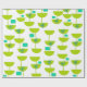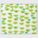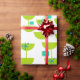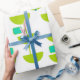 Este papel envolvente tiene un diseño moderno de mediados del siglo XX de círculos verdes que parecen vasos unidos con estallidos turquesa y rectángulos.