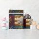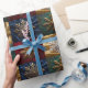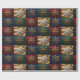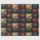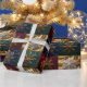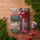 Papel envuelto con filetes de oro acuerdan copos de nieve en rojo, azul, verde imágenes de terciopelo con un copo de nieve blanco en una imagen de terciopelo dorado. Juntos se repiten en un papel envuelto de colores muy vivos.