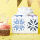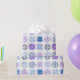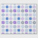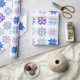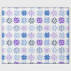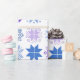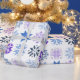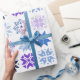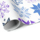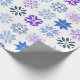 Este papel de envoltura tiene un diseño invernal de diferentes copos de nieve en azul y violeta en filas.