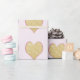 Diseño minimalista y lindo que representa el falso corazón del purpurina del oro en fondo rosa claro.