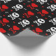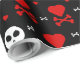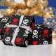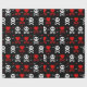 Patrón sin foco de un blanco con cráneo rojo y fondo negro con corazones y huesos cruzados.