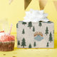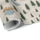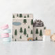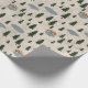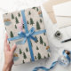 Soft illustrated wrapping paper featuring a cozy forest pattern with evergreen trees, small ponds, and a wooden bridge.