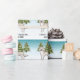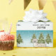 El personalizado original de Destei ilustracion de un lindo crema inglesa de raza Golden Retriever. El perro es colocado en una escena invernal con tres abetos verdes. El fondo es un degradado de azul a blanco que da al diseño ese aspecto frío del invierno. Hay un área de texto personalizable que ahora dice: "¡Feliz Navidad!" junto con un nombre personalizado.