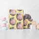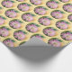 La envoltura de regalo con flores de bonito está decorada con un cuadro de arte floral que representa una flor de crisantemo rosa morado y blanco cremoso, con un brote y una hoja sobre el ocre dorado y el verde oliva sobre un fondo amarillo carnicero.