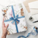 Un encantador y lindo envolvimiento de lindos animales de la selva. Un zorro, un erizo, un búho y un venado de color acuático sobre un suave fondo de bosque verde. Perfecto para un regalo neutral de género. Animales de hadas encantados.