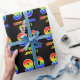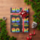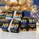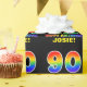 Este divertido, alegre y colorido diseño de papel de envoltura con temática de cumpleaños presenta un gran número de "90" y el mensaje "FELIZ CUMPLEAÑOS", ambos con un coloreado de patrones inspirado en el gradiente del espectro del arcoiris, junto con un audaz nombre de destinatario editable amarillo. El fondo es negro de color. Papel de envoltura divertida como este podría ser usado cuando se le dan regalos al envasado a alguien en celebración de su cumpleaños número noventa. [~Z0000475]