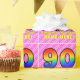 Este diseño de papel de envolvimiento animado y divertido con temática de cumpleaños 90 presenta un gran número "90" con un patrón colorido inspirado en la apariencia de un espectro arcoiris. También incluye el mensaje "Feliz cumpleaños número 90", y un nombre de personalizable. El fondo está decorado con rayas rosa claro y rosa oscuro que contienen formas cariñosas de corazón rosado. Papel de envoltura divertida como este podría ser usado cuando se le dan regalos al envasado a alguien en celebración de su 90 cumpleaños. [~Z0000415]