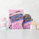 Grabaciones de vinilo azul y rosa retro, boombox, videojuegos y cintas de cassette de regalo de cumpleaños.