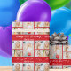 Customize your own red birthday wrapping paper with a cute 5 photo collage. Add the person's name and year in white script above the five photographs for bright, bold personalized gifts.
