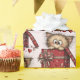 Box is wrapped in red, and a bow with a little hearts pattern.