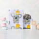 Papel envuelto con un ilustracion de un lindo koala gris comiendo algunas hojas de eucalipto, usando una lujosa corona de oro. Se coloca sobre un fondo de color de agua digital púrpura claro.