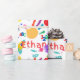 Este diseño de papel de envoltura, adorable y colorido, presenta una colección de colores, con una colorida impresión a mano, ABC, 123 con nombre y fondo. Este papel de envoltura puede ser personalizado con el nombre de cualquier niño. Esta impresionante pintura con el dedo ABC, 123 materiales de fiesta temáticos es una excelente incorporación a cualquier fiesta de cumpleaños para niños de todas las edades.