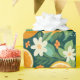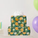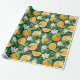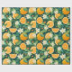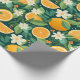 This citrus wrapping paper blends glowing orange slices with creamy blossoms and lush green foliage, all set against a dramatic dark green background that makes every detail pop.