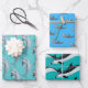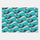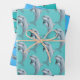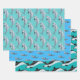 Papel de regalo de delfines, en tres diseños y colores, impreso en tres hojas grandes que vienen enrolladas, no dobladas. Los colores azul marino, turquesa y verde laguna tienen varios tipos de delfines nadando. Los diseños son perfectos para cualquier celebración de cumpleaños o regalo para una fiesta de verano.