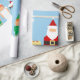 Una escena festiva nevada que muestra a papá vestido de Papá Noel, con un traje grande, rojo y redondo de Papá Noel. Los niños están vestidos de ayudantes de Papá Noel, elfos y un ángel. La mascota de la familia, un perrito y un búho nevado de invierno también llevan sombreros de Papá Noel. ¡Feliz Navidad!