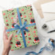 Papel de regalo de regalo de Navidad de fútbol creativo o decoración de fiesta deportiva con jugador de fútbol Santa rodeado de dulces, diseñado para fanáticos del deporte, entrenador y jugadores del equipo.
