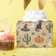 A warm, Southwestern-inspired Halloween repeating pattern that blends classic spooky motifs with desert charm. Earthy pumpkins in muted orange and sage green are scattered among black cats, crescent moons, bats, witches’ hats, spiders, spiderwebs, and tiny stars, alongside cacti, desert plants, and subtle skull accents. Set against a sandy, sun-washed background with a soft grainy texture, the design feels rustic, cozy, and atmospheric rather than scary. The palette of warm sand, clay orange, olive green, charcoal, and soft cream gives the pattern a calm, autumnal desert-night mood.