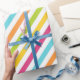 Diagonal stripes in vibrant colors—pink, blue, orange, green, and yellow—against a white background. The pattern is bright and energetic.