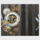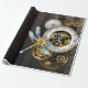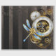 Diales antiguos con artes de oro y latón, decorados con libélula mecánica sobre fondo marrón, rayado. Steampunk.