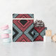 Este papel de envoltura tiene un diseño art deco de formas diamantíferas con líneas diagonales, diamantes negros y diamantes de colores en tonos azules y arándanos.