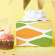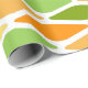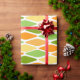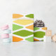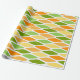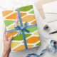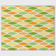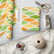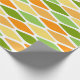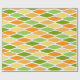 Este papel de envoltura tiene un diseño moderno de mediados de siglo de diamantes aplanados en tonos amarillos, naranjas y verdes.