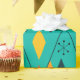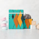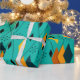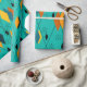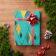 Este papel de envoltura tiene un diseño atómico moderno de diamantes de mediados de siglo, y estallidos en un campo de turquesa.