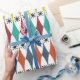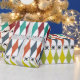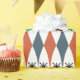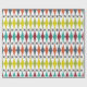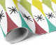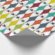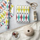 Este papel de envoltura tiene un diseño moderno de mediados de siglo de diamantes estirados y estallidos en un campo de blanco.