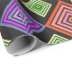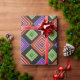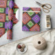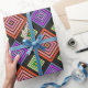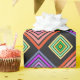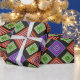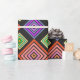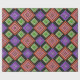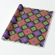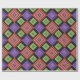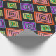 Este papel de envoltura tiene un diseño geométrico de diamantes concéntricos en naranja y rosa, azul y púrpura, amarillo y verde, sobre fondo negro.