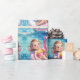 Un lindo chica joven se desliza suavemente sobre una carroza rosa y blanca de unicornio, deslizándose por una piscina azul y cristalina.