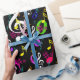 Coloridos símbolos y notas musicales con música, notas, clef, treble, quaver, bajo, crochet sobre fondo negro