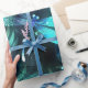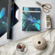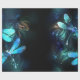 Dos libélulas transparentes, luminosas, turquesas, dibujadas de forma artística sobre el fondo nocturno con algas lacustres luminosas y luciérnagas. Flauta de dragón resplandeciente.