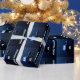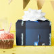 Un modernístico dreidel azul metálico contra un fondo oscuro y nocturno. Dos de las letras hebreas encontradas en un dreidel, una monja y un shin, brillan brillantemente. El texto que dice "Feliz Hanukkah" también aparece en azul brillante y blanco.