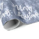 Este papel de envolvimiento moderno y brillante presenta las palabras "Feliz Navidad" con un cepillo blanco sobre un polvoriento fondo metalizado azul falso cepillado decorado con un brillante patrón floral purpurina.