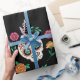 Este colorido papel de envoltura de regalo presenta un Día de los Muertos o el tema Muertos en un fondo negro. Dos cráneos de azúcar adornados con flores rosas y naranjas y vegetación floral. La imagen está enlosada a través del papel envolvente.