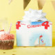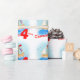 Papel de embalaje del cumpleaños que ofrece poco barco de madera con la vela y la bandera en un día ventoso en el mar en azul y rojo. Personalice este cuarto papel del cumpleaños de los muchachos caprichosos con su nombre y edad. Lee actualmente a Connor 4 hoy. Pintado únicamente en acuarela y diseñado por Sarah Trett.