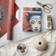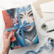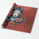 El secreto de la belleza pálida, el hermoso chica japonés. Su cabello está enfundado en un elegante bollo, dándole un toque elegante. Un punto rojo brillante está estampado en su frente, creando un punto focal. Su rostro está intrincadamente decorado con patrones azules y rojos, enfatizando su individualidad y quizás también simbolismo cultural. Lleva una elegante bata azul y blanca que armoniosamente combina con los colores de sus adornos.