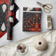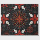 Intricate black background with a symmetrical floral pattern in red, white, and gold. Curved lines and dots add detail, creating an elegant, festive feel.