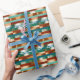 Este Navidad presenta un elegante diseño de papel de envoltura con estribillo festivo con tonos de oro metálico, verde azulado, verde y cobre alternos, creando una estética vacacional elegante y moderna. La característica destacada es el texto de personalizable que se ejecuta a lo largo de una de las franjas, que se puede personalizar con cualquier mensaje, como "Feliz Navidad [Nombre] de [Remitente]". El aspecto metálico le aporta un toque de brillo, perfecto para elevar su presentación de regalo de vacaciones. Ideal para crear un toque único y personal a sus regalos envueltos.