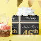 Este sencillo y elegante diseño de papel envolvente incluye un mensaje personalizado como "Nombre: Este es el 46º cumpleaños" (con el "46º" con un aspecto de color falso/imitación dorado) dentro de un área cuadrada de color negro con un simple contorno de borde. El nombre se encuentra en un texto elegante de color blanco tipo script, y se puede personalizar. El envolvimiento de papel como este podría ser usado para envolver regalos de cumpleaños para alguien que está celebrando su 46º cumpleaños. [~Z0000217]