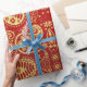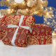 Un elegante papel de envoltura de Navidades paisley rojo y dorado para un toque de clase para sus regalos de vacaciones.