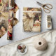 Este patrón de papel de envoltura de Navidades tiene un estilo victoriano vintage, con un elegante collage de elementos clásicos de vacaciones. El diseño incluye ilustraciones muy detallados de Santa Claus, ángeles, mujeres de la era victoriana y decoraciones festivas como las puntitas, las pineconas y los adornos. La paleta de colores está dominada por rojos profundos, marfil, oro y tonos marrones suaves, lo que crea un ambiente lujoso y nostálgico. Cada elemento está enmarcado en bordes dorados ornamentados con un toque de brillo, realzando el aspecto antiguo y opulento. Este papel envolvente evoca el encanto cálido y tradicional de los Navidades, perfecto para unas vacaciones clásicas.
