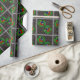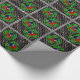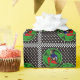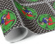 Estiloso Navidad envolvimiento de regalos con iconosEs variación original en un personaje elfo de Maxfield Parrish de la era pre WI con Santa Claus Piernas de polka rojo y negro en un círculo kelly verde rodeado de la frase "Feliz Navidad!" Fondo de blanco sobre puntos de polka negro y bordes de tablero de ajedrez.