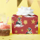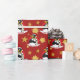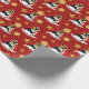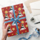 Navidades envolviendo papel con el ilustracion de un adorable emperador sonriente pingüino con sombrero rojo de Santa; diseño personalizado de vacaciones para Navidades para niños; diseño personalizado de vacaciones para Navidades para niños, sobre fondo rojo con plantilla de texto de personalizable para su nombre o mensaje; ilustrado por Radka Kavalcova