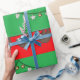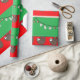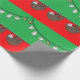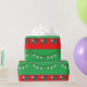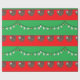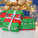 Decoración o envolvimiento de regalos de vacaciones Navidades únicos con bromas graciosas sobre un fondo rojo y verde festivo.