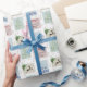Papel de envolver personalizado con sellos de correo vintage de azul verde rojo y beige decorados con un escenario, cañas de pino, bayas de invierno y palabras festivas (Let it Snow, Merry Christmas and, Joy Hope Peace Believe Navidades). La plantilla está configurada para personalizar uno de los sellos con el inicio de sesión y el nombre. Los sellos postales se sientan sobre un patrón de fondo de árboles de navidad. Por favor, navegue por mi tienda en busca de diseños similares, con y sin fotos.