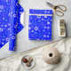 Envuelva para arriba sus regalos de Jánuca con este papel que ofrezca la estrella de David en una variedad de diseños y sombras de azul y del blanco en un fondo azul.