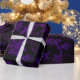 Papel de envoltura de damasco negro y violeta con estrellas doradas luminosas.