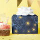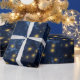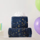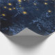 Papel de envoltura floral gótica azul marino con estrellas doradas luminosas.