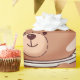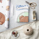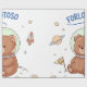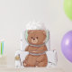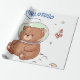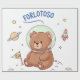 Un adorable oso astronauta se sienta felizmente en un pequeño planeta, soñando entre estrellas y cohetes.