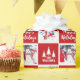 Papel de envoltura rojo y blanco personalizado "Felices Fiestas" con el nombre de la familia, 2 fotos personalizados y un patrón de árbol. Ideal para terminar sus regalos de Navidad en invierno y en temporada de vacaciones.